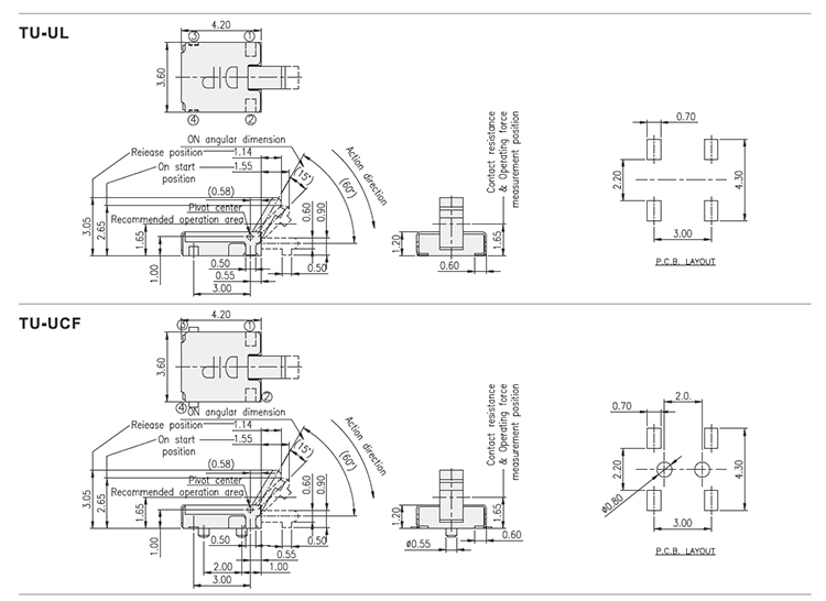 Contact Rating: 50uA,3V DC to 10mA,5V DC Contact Resistance 1Ω max Insulation resistance 100 MΩ min Dielectric strength: 100V AC/1 minute Operating force: 40gf max Travel: 60°